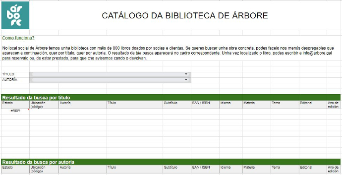 Sodes benvidas no noso local social para botar unha ollada. Con todo, tede presente que esta non é a actividade principal de Árbore e que as persoas que están atendendo na tenda non se encargan da biblioteca, polo que non vos van poder asesorar nin van xestionar os empréstitos de libros. Para asegurarvos de que ides poder levar as obras que vos interesan no momento en que pasedes por Árbore, recomendamos escribir con 24 horas de antelación (días laborables) a info@arbore.gal.