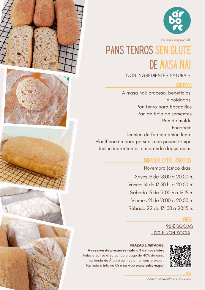 Neste obradoiro aprenderemos todo o necesario para facer un pan artesanal sen glute na casa, sen perder a cabeza nen o peto! Con Natalia elaboraremos receitas únicas con ingredientes naturais e fariñas simples (sarraceno, arroz, millo miúdo...) coas que crear pans nutritivos, dixestivos e saborosos.
